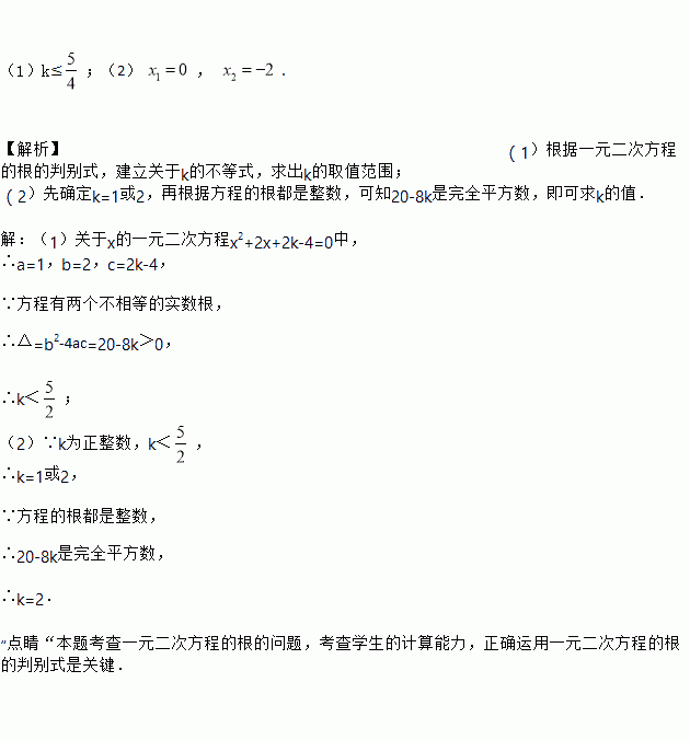(1)k≤;(2) , . 【解析】(1)根据一元二次方程的根的判别式,建立关于k的不等式,求出k的取值范围; (2)先确定k=1或2,再根据方程的根都是整数,可知20-8k是完全平方数,即可求k的值. 【解析】 (1)关于x的一元二次方程x2+2x+2k-4=0中, ∴a=1,b=2,c=2k-4, ∵方程有两个不相等的实数根, ∴△=b2-4ac=20-8k>0, ∴k...