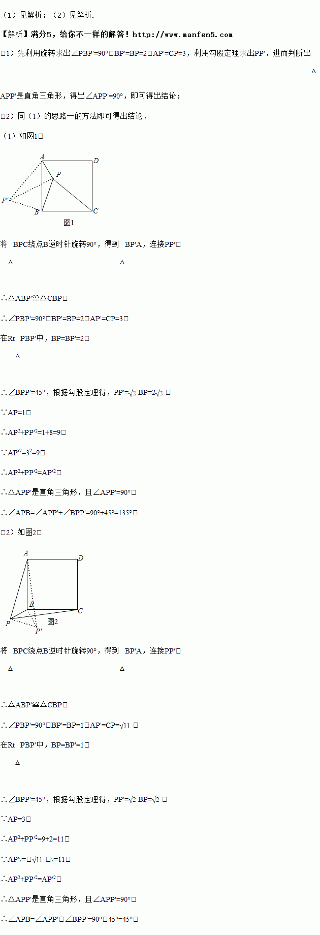 思路二:将△APB绕点B顺时针旋转90°,得到△CP'B,连接PP′,求出∠APB的度数.