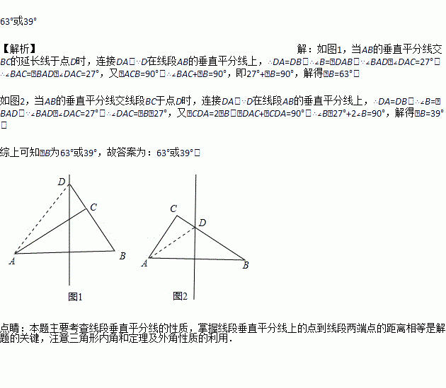 △ABC中,∠C=90°,AB的垂直平分线交直线BC于D,若∠BAD-∠DAC=27°,则∠B等于_____________.
