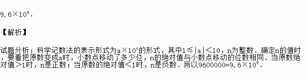 9.6×106. 【解析】 试题分析:科学记数法的表示形式为a×10n的形式,其中1≤|a|<10,n为整数.确定n的值时,要看把原数变成a时,小数点移动了多少位,n的绝对值与小数点移动的位数相同.当原数绝对值>1时,n是正数;当原数的绝对值<1时,n是负数.所以9600000=9.6×106.