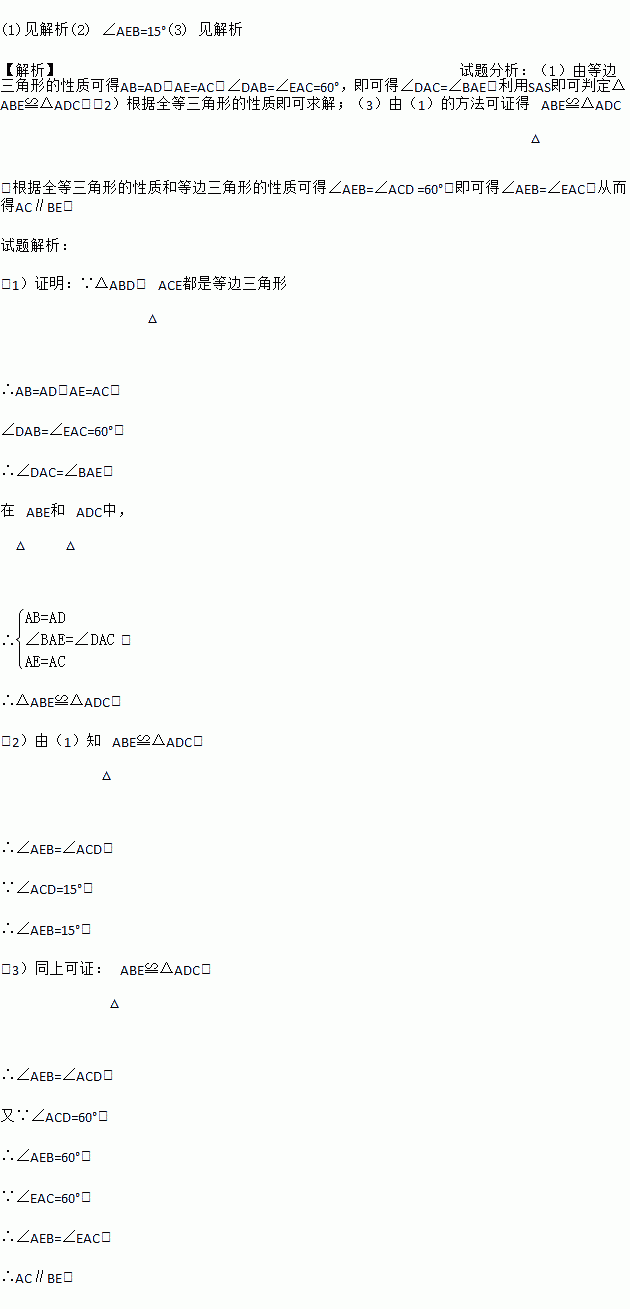 (3)如图2,当△ABD与△ACE的位置发生变化,使C、E、D三点在一条直线上,求证:AC∥BE.