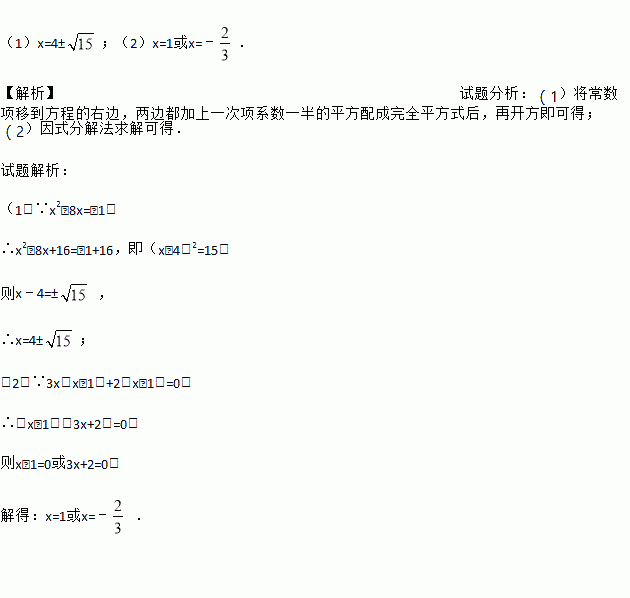 解下列方程:(1)x2﹣8x+1=0(配方法);(2)3x(x﹣1)=2﹣2x.