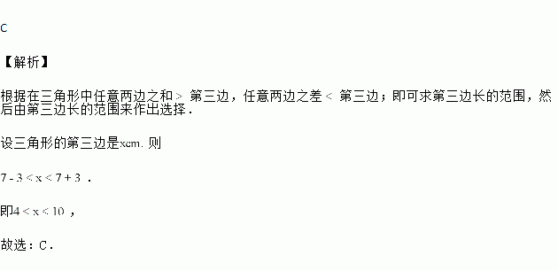 已知三角形中的两边长分别为3cm和7cm,则下列长度的四条线段中能作为第三边的是