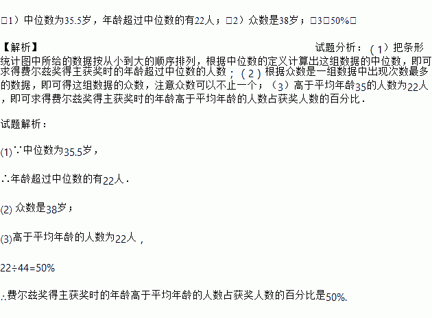 (1)费尔兹奖得主获奖时的年龄超过中位数的有多少人?