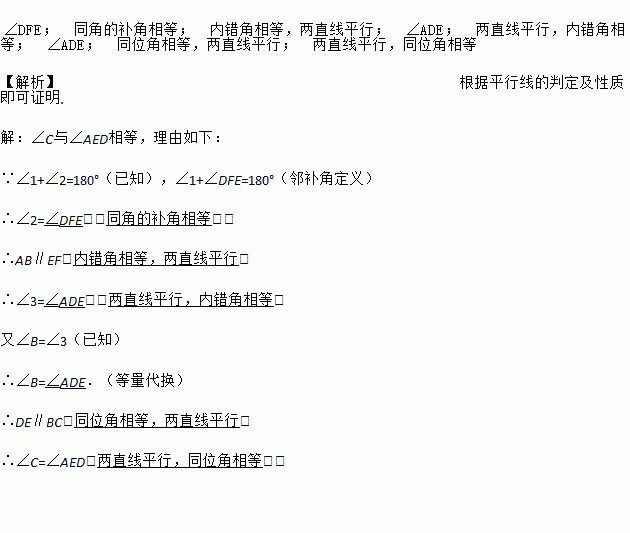 ∠DFE; 同角的补角相等; 内错角相等,两直线平行; ∠ADE; 两直线平行,内错角相等; ∠ADE; 同位角相等,两直线平行; 两直线平行,同位角相等 【解析】根据平行线的判定及性质即可证明. 【解析】 ∠C与∠AED相等,理由如下: ∵∠1+∠2=180°(已知),∠1+∠DFE=180°(邻补角定义) ∴∠2=∠DFE.(同角的补角相等), ∴AB∥EF(内...