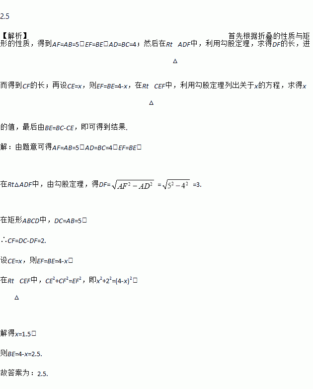 矩形ABCD中,AB=5,BC=4,将矩形折叠,使得点B落在线段CD的点F处,则线段BE的长为_____________.