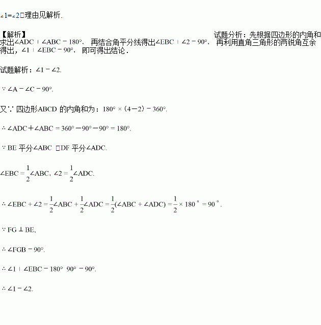 如图,在四边形ABCD中,∠A=∠C=90°,∠ABC、∠ADC的平分线分别与AD、BC相交于E、F两点,FG⊥BE于点 G.∠1与∠2之间有怎样的数量关系?为什么?