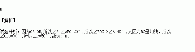 如图,AB是的弦,AO的延长线交过点B的的切线于点C,如果∠ABO=20°,则∠C的度数是( )