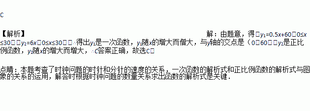 14:00时,时钟中时针与分针的位置如图所示(分针在射线OA上),设经过xmin(0≤x≤30),时针、分针与射线OA所成角的度数分别为y1°、y2°,则y1、y2与x之间的函数关系图是 ( )