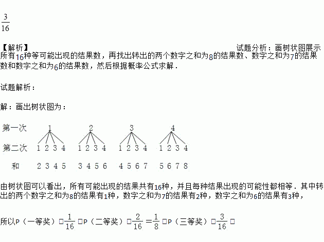 元旦期间,某商场设置了如图所示的幸运转盘,转盘分成4个大小相同的扇形,分别标有数学1,2,3,4,指针的位置固定,转盘可以自由转动,当转动的转盘停止后,其中的某个扇形会停在指针所指的位置(指针指向两个扇形的交线时,当作右边的扇形).商场规定:凡是参加抽奖的顾客均可转动转盘两次,如果两次转动中指针指缶扇形上的数字之和为8是一等奖,数字之和为7是二等奖,数字之和为6是三等奖,标号之和为其他数字则获得一份纪念品,请分别求出顾客抽中一、二、三等奖的概率.