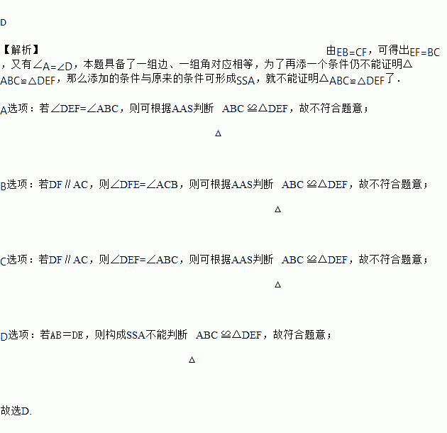 如图,E、B、F、C四点在一条直线上,EB=CF ,∠A =∠D,添以下哪一个条件仍不能证明△ABC ≌△DEF的是( )
