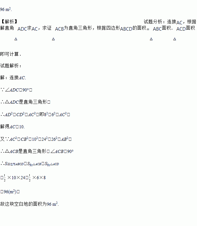 有一块空白地,如图,∠ADC=90°,CD=6 m,AD=8 m,AB=26 m,BC=24 m.试求这块空白地的面积.