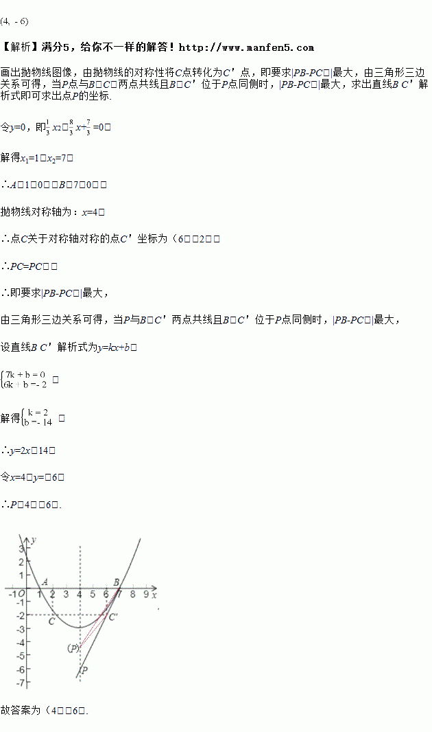 已知抛物线与轴交于、两点(点在点左侧),是抛物线外一点,在抛物线的对称轴上存在一点,使得值最大,则点坐标是________.