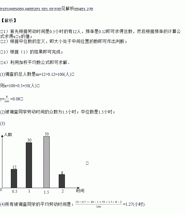 (2)被抽样调查的同学劳动时间的众数是 ,中位数是 ;