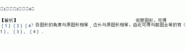 如图所示,有(1)~(4)4个条形方格图,图中由实线围成的图形与前图全等的有