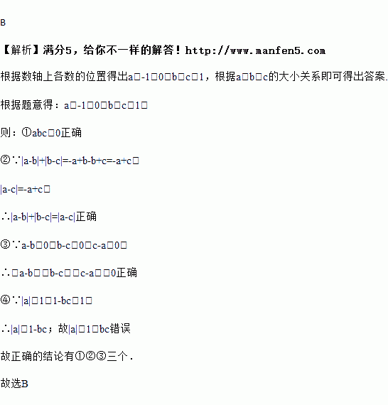 有理数 a、b、c 在数轴上对应的点的位置,如图所示:① abc<0;② |a-b|+|b-c|=|a-c|;③ (a-b)(b-c)(c-a)>0;④ |a|<1-bc,以上四个结论正确的有( )个
