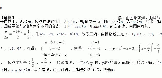 B 【解析】【解析】 由图象可知,抛物线开口向上,则a>0,顶点在y轴右侧,则b<0,与y轴交于负半轴,则c<0,∴abc>0,故①正确,函数图象与x轴有两个不同的交点,则b2﹣4ac>0,即4ac<b2,故②正确,由图象可知, ,则2b=﹣2a,2a+b=﹣b>0,故③正确,由抛物线过点(﹣1,0),(0,﹣2),(2,0),可得: ,解得: ,∴ =,∴顶点坐标是(,﹣),故④错误,∴...