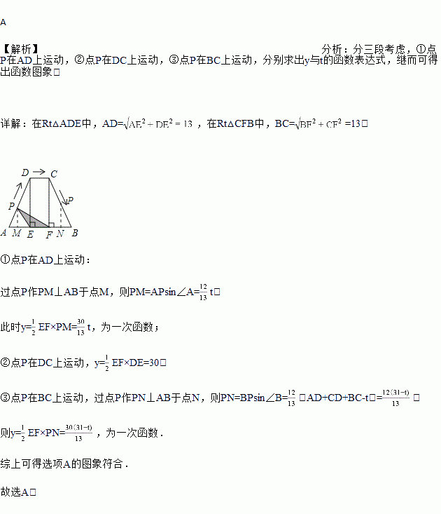 如图,梯形ABCD中,AB∥DC,DE⊥AB,CF⊥AB,且AE=EF=FB=5,DE=12动点P从点A出发,沿折线AD-DC-CB以每秒1个单位长的速度运动到点B停止.设运动时间为t秒,y=