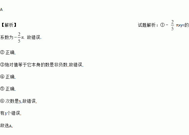 A 【解析】试题解析:①﹣ πxy2的系数为故错误. ② 正确. ③绝对值等于它本身的数是非负数.故错误. ④ 正确. ⑤ 正确. ⑥ 次数是5.故错误. 有3个错误. 故选A.