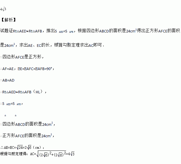 如图,正方形AFCE中,D是边CE上一点,B是CF延长线上一点,且AB=AD,若四边形ABCD的面积是24cm2.则AC长是_____cm.