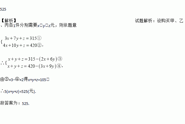 有甲、乙、丙三种货物,若购甲3件、乙7件、丙1件共需315元;若购甲4件,乙10件,丙1件,共需420元,问购甲、乙、丙各5件共需________ 元.