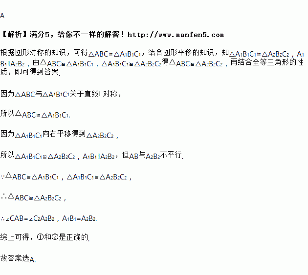 如图,△ABC与△A1B1C1关于直线l对称,将△A1B1C1向右平移得到△A2B2C2,由此得出下列判断:①∠A=∠A2;②A1B1=A2B2;③AB∥A2B2.其中正确的是( )