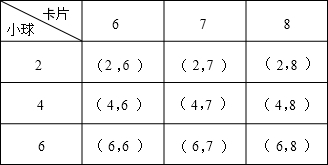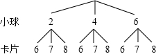 在一个不透明的口袋里有分别标注2、4、6的3个小球(小球除数字不同外,其余都相同),另有3张背面完全一样、正面分别写有数字6、7、8的卡片.现从口袋中任意摸出一个小球,再从这3张背面朝上的卡片中任意摸出一张卡片.
