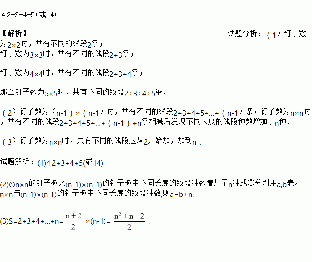 (2)写出(n-1)×(n-1)和n×n的两个钉子板上,不同长度值的线段种数之间的关系;(用式子或语言表述均可).