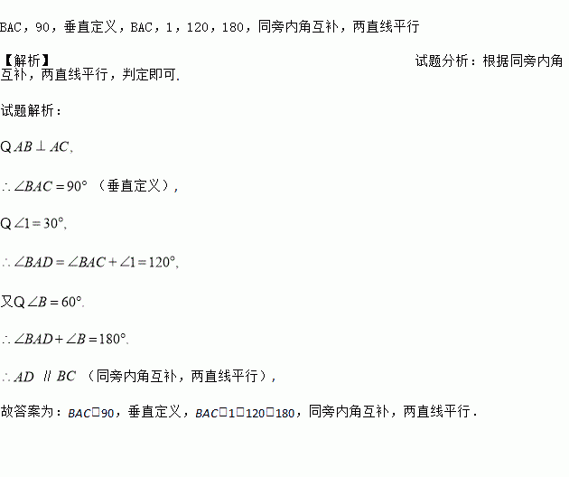 如图,已知∠1=30°,∠B=60°,AB⊥AC,将证明AD∥BC的过程填写完整.