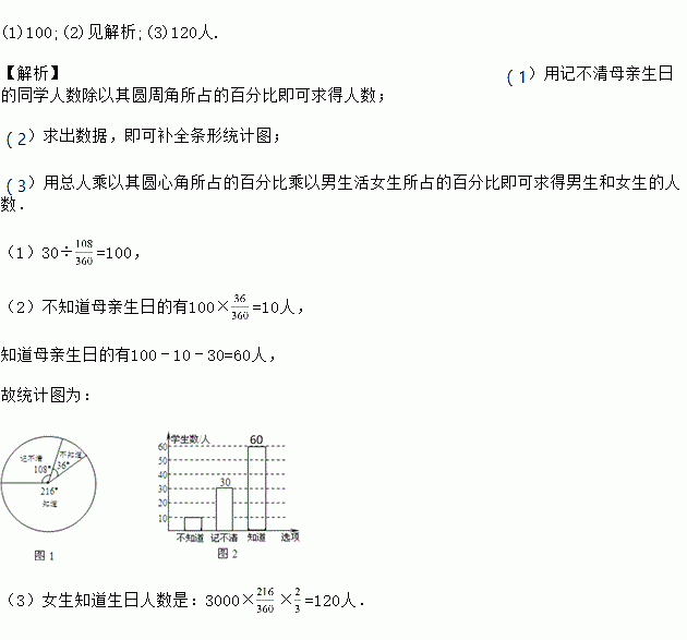 (3)若这所学校共有学生3000人,已知被调查的学生中,知道母亲生日的女生人数是男生人数的2倍,请你通过计算估计该校知道母亲生日的女生有多少人?
