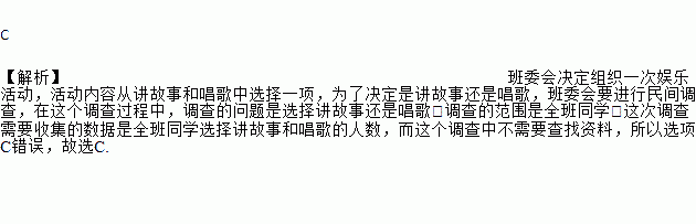 C ¡¾½âÎö¡¿°àί»á¾ö¶¨×éÖ¯Ò»´ÎÓéÀֻ£¬»î¶¯ÄÚÈÝ´Ó½²¹Êʺͳª¸èÖÐÑ¡ÔñÒ»ÏΪÁ˾ö¶¨Êǽ²¹ÊÊ»¹Êdzª¸è£¬°àί»áÒª½øÐÐÃñ¼äµ÷²é£¬ÔÚÕâ¸öµ÷²é¹ý³ÌÖУ¬µ÷²éµÄÎÊÌâÊÇÑ¡Ôñ½²¹ÊÊ»¹Êdzª¸è£»µ÷²éµÄ·¶Î§ÊÇÈ«°àͬѧ£»Õâ´Îµ÷²éÐèÒªÊÕ¼¯µÄÊý¾ÝÊÇÈ«°àͬѧѡÔñ½²¹Êʺͳª¸èµÄÈËÊý£¬¶øÕâ¸öµ÷²éÖв»ÐèÒª²éÕÒ×ÊÁÏ£¬ËùÒÔÑ¡ÏîC´íÎ󣬹ÊÑ¡C.