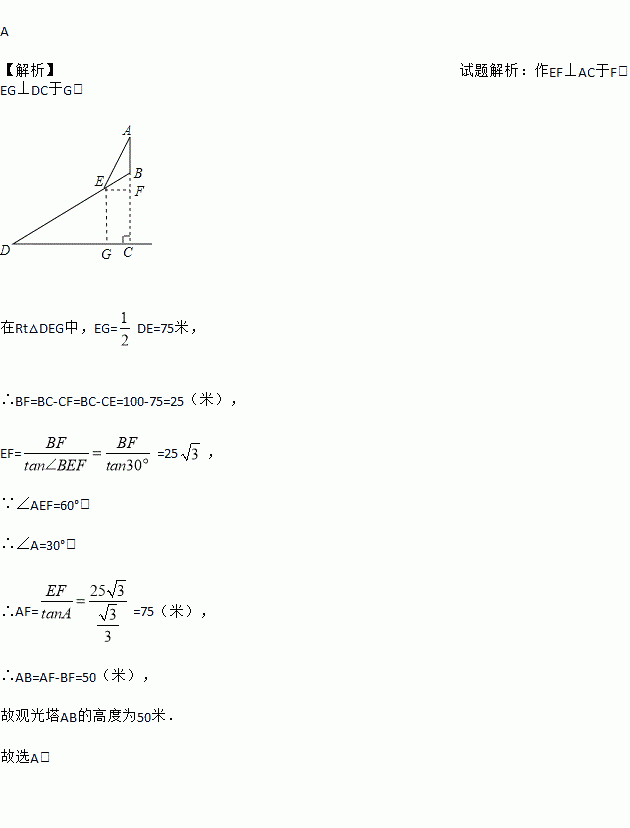 A 【解析】试题解析:作EF⊥AC于F,EG⊥DC于G, 在Rt△DEG中,EG=DE=75米, ∴BF=BC-CF=BC-CE=100-75=25(米), EF==25, ∵∠AEF=60°, ∴∠A=30°, ∴AF==75(米), ∴AB=AF-BF=50(米), 故观光塔AB的高度为50米. 故选A.