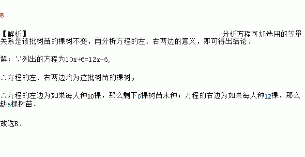 B 【解析】分析方程可知选用的等量关系是该批树苗的棵树不变,再分析方程的左、右两边的意义,即可得出结论. 【解析】 ∵列出的方程为10x+6=12x-6, ∴方程的左、右两边均为这批树苗的棵树, ∴方程的左边为如果每人种10棵,那么剩下6棵树苗未种;方程的右边为如果每人种12棵,那么缺6棵树苗. 故选B.