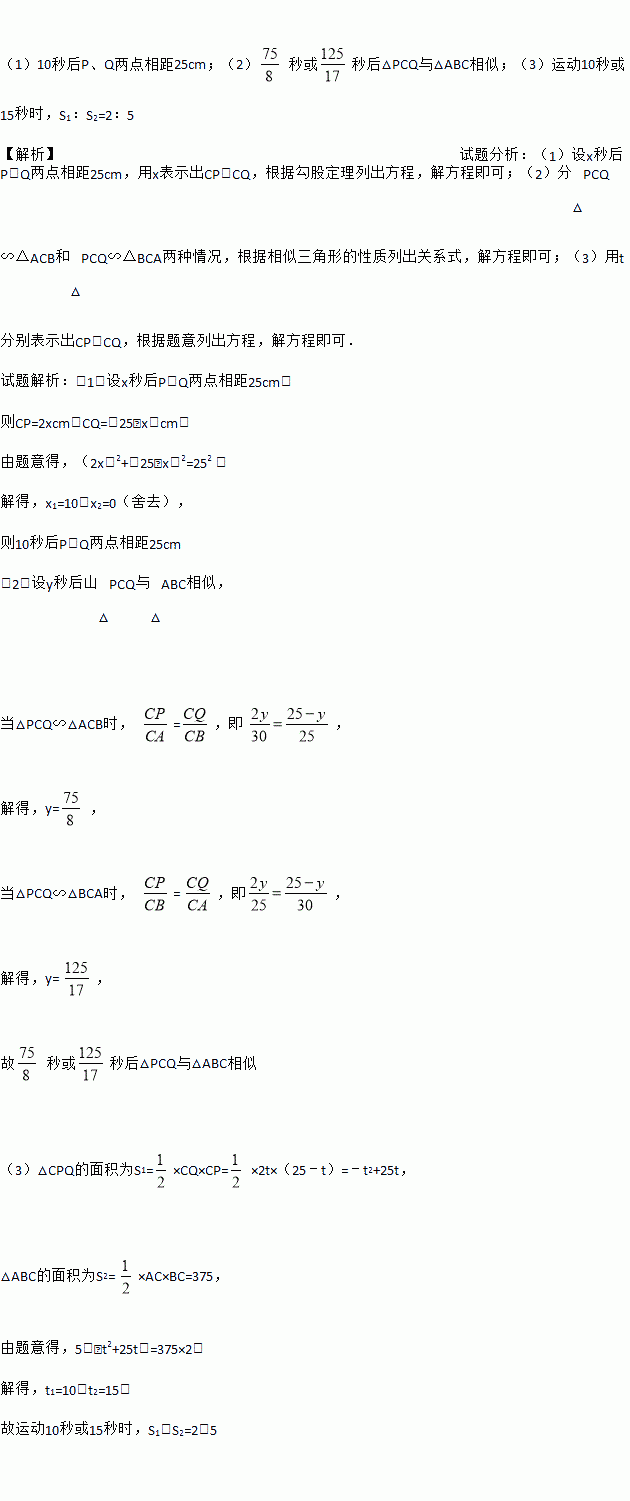 如图,在Rt△ACB中,∠C=90°,AC=30cm,BC=25cm,动点P从点C出发,沿CA方向运动,速度是2cm/s,动点Q从点B出发,沿BC方向运动,速度是1cm/s.