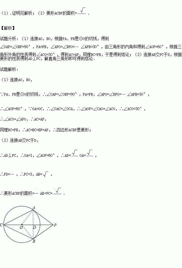 (2)若⊙O半径为1,求菱形ACBP的面积.