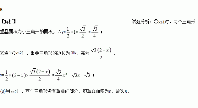 如图,边长分别为1和2的两个等边三角形,开始它们在左边重合,大三角形固定不动,然后把小三角形自左向右平移直至移出大三角形外停止.设小三角形移动的距离为x,两个三角形重叠面积为y,则y关于x的函数图象是( )