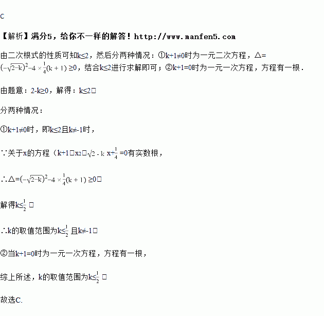 A. k≤2且k≠﹣1 B. k≤且k≠﹣1 C. k≤ D. k≥