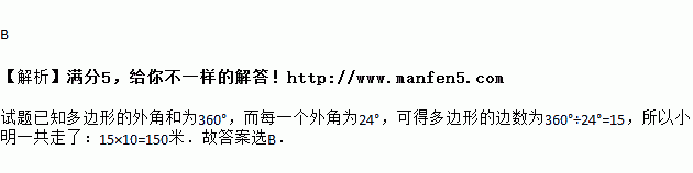 如图所示,小华从A点出发,沿直线前进10米后左转24°,再沿直线前进10米,又向左转24°,……,照这样走下去,他第一次回到出发地A点时,一共走的路程是( )
