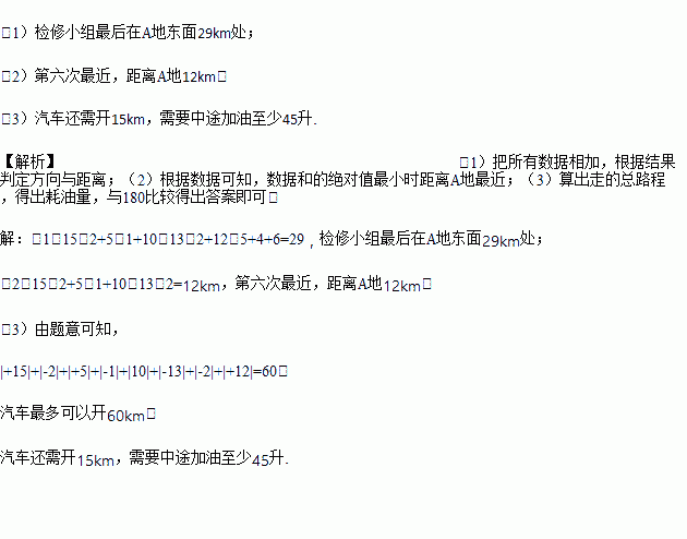 某检修小组乘一辆汽车在东西走向的公路上检修线路,约定向东走为正,某天从A地出发到收工时的行走记录如下(单位:km):+15,-2,+5,-1,+10,-13,-2,+12,-5,+4,+6,求: