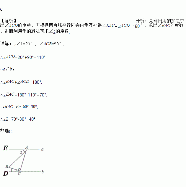 已知直线a∥b,将一块含30°的直角三角尺按如图方式放置(∠ABC=60°),其中A,C两点分别落在直线a,b上,若∠1=20°,则∠2的度数为( )