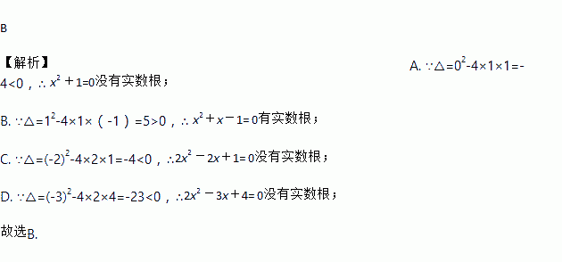 B 【解析】A. ∵△=02-4×1×1=-4<0,∴ x2 +1=0没有实数根; B. ∵△=12-4×1×(-1)=5>0,∴ x2+x-1= 0有实数根; C. ∵△=(-2)2-4×2×1=-4<0,∴2x2 -2x+1= 0没有实数根; D. ∵△=(-3)2-4×2×4=-23<0,∴2x2 -3x+4= 0没有实数根; 故选B.