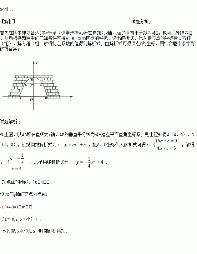 如图,有一座抛物线型拱桥,已知桥下在正常水位AB时,水面宽8m,水位上升3m, 就达到警戒水位CD,这时水面宽4m,若洪水到来时,水位以每小时0.2m的速度上升,求水过警戒水位后几小时淹到桥拱顶.