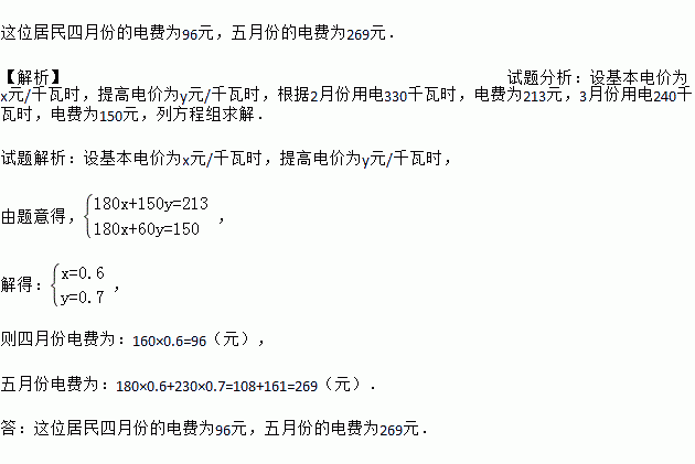 为鼓励居民节约用电,我市自2012年以来对家庭用电收费实行阶梯电价,即每月对每户居民的用电量分为三个档级收费,第一档为用电量在180千瓦时(含180千瓦时)以内的部分,执行基本价格;第二档为用电量在180千瓦时到450千瓦时(含450千瓦时)的部分,实行提高电价;第三档为用电量超出450千瓦时的部分,执行市场调节价格.我市一位同学家今年2月份用电330千瓦时,电费为213元,3月份用电240千瓦时,电费为150元.已知我市的一位居民今年4、5月份的家庭用电量分别为160和 410千瓦时,请你依据该同学家的缴费情况,计算这位居民4、5月份的电费分别为多少元?