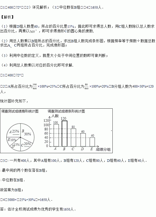 (4)本次调查测试成绩在80分以上(含80分)为优秀,该中学共有3000人,请估计全校测试成绩为优秀的学生有多少人?