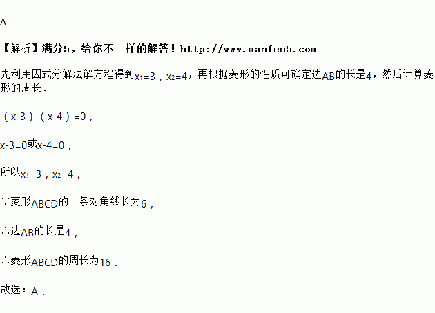 菱形ABCD的一条对角线长为6,边AB的长是方程x2﹣7x+12=0的一个根,则菱形ABCD的周长为( )