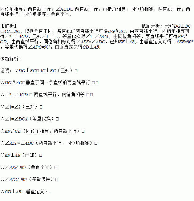 已知,如图,DG⊥BC,AC⊥BC,EF⊥AB,∠1=∠2,求证:CD⊥AB.