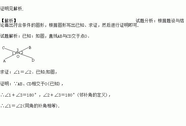 求证:对顶角相等(请画出图形,写出已知、求证、证明.)