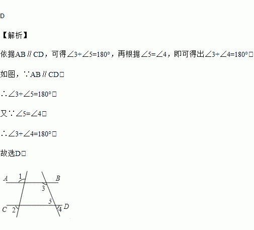 A. ∠1=∠2 B. ∠3=∠4 C. ∠1+∠3=180° D. ∠3+∠4=180°