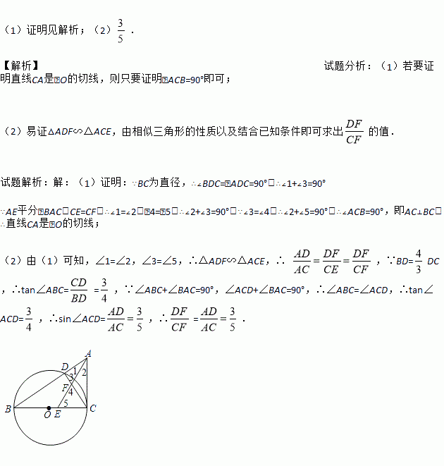 如图,△ABC中,以BC为直径的⊙O交AB于点D,AE平分∠BAC交BC于点E,交CD于点F.且CE=CF.