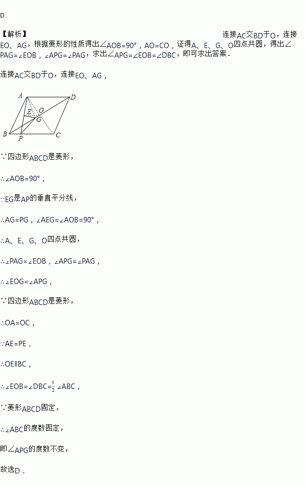 如图,在菱形ABCD中,点P是BC边上一动点,连结AP,AP的垂直平分线交BD于点G,交 AP于点E,在P点由B点到C点的运动过程中,∠APG的大小变化情况是( )
